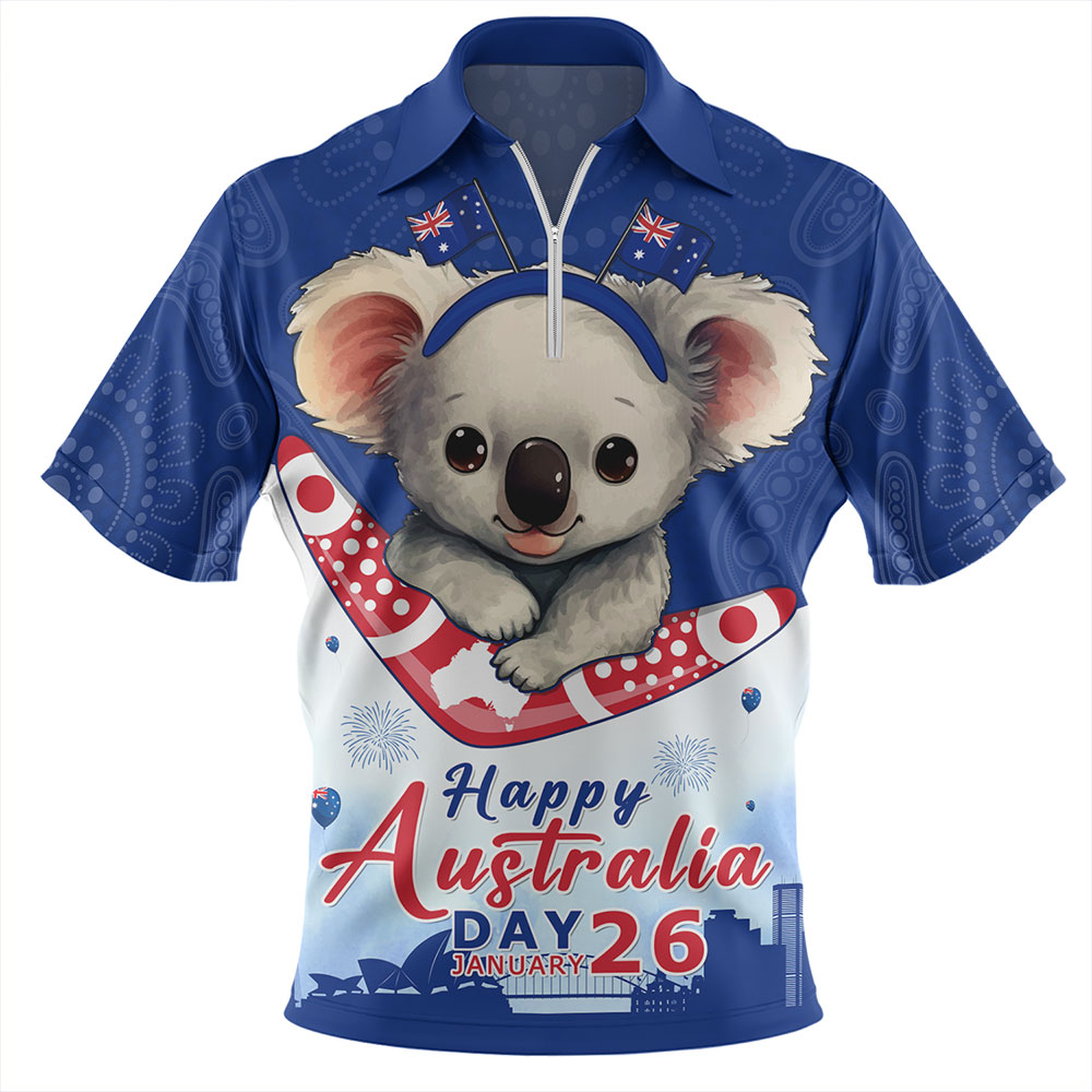 Australia Zip Polo Shirt Happy Australia Day Koala With Boomerang Edition
