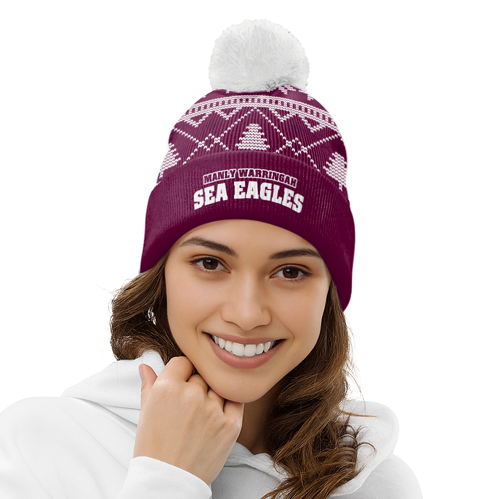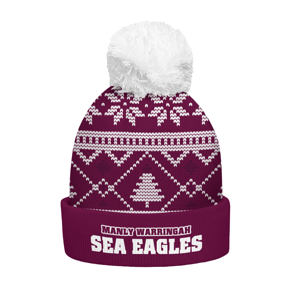 Manly Warringah Sea Eagles Bobble Beanie Hat Merry Christmas Game Ready Team Knit Edition