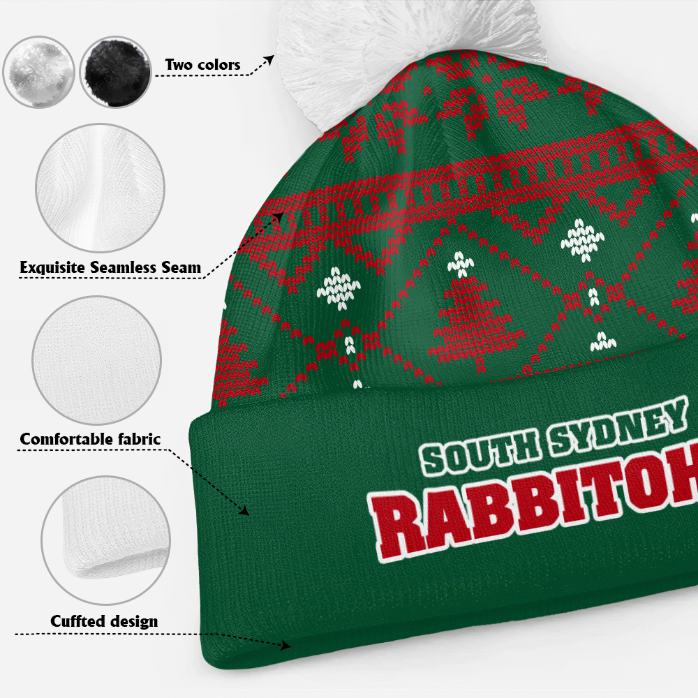 South Sydney Rabbitohs Bobble Beanie Hat Merry Christmas Game Ready Team Knit Edition